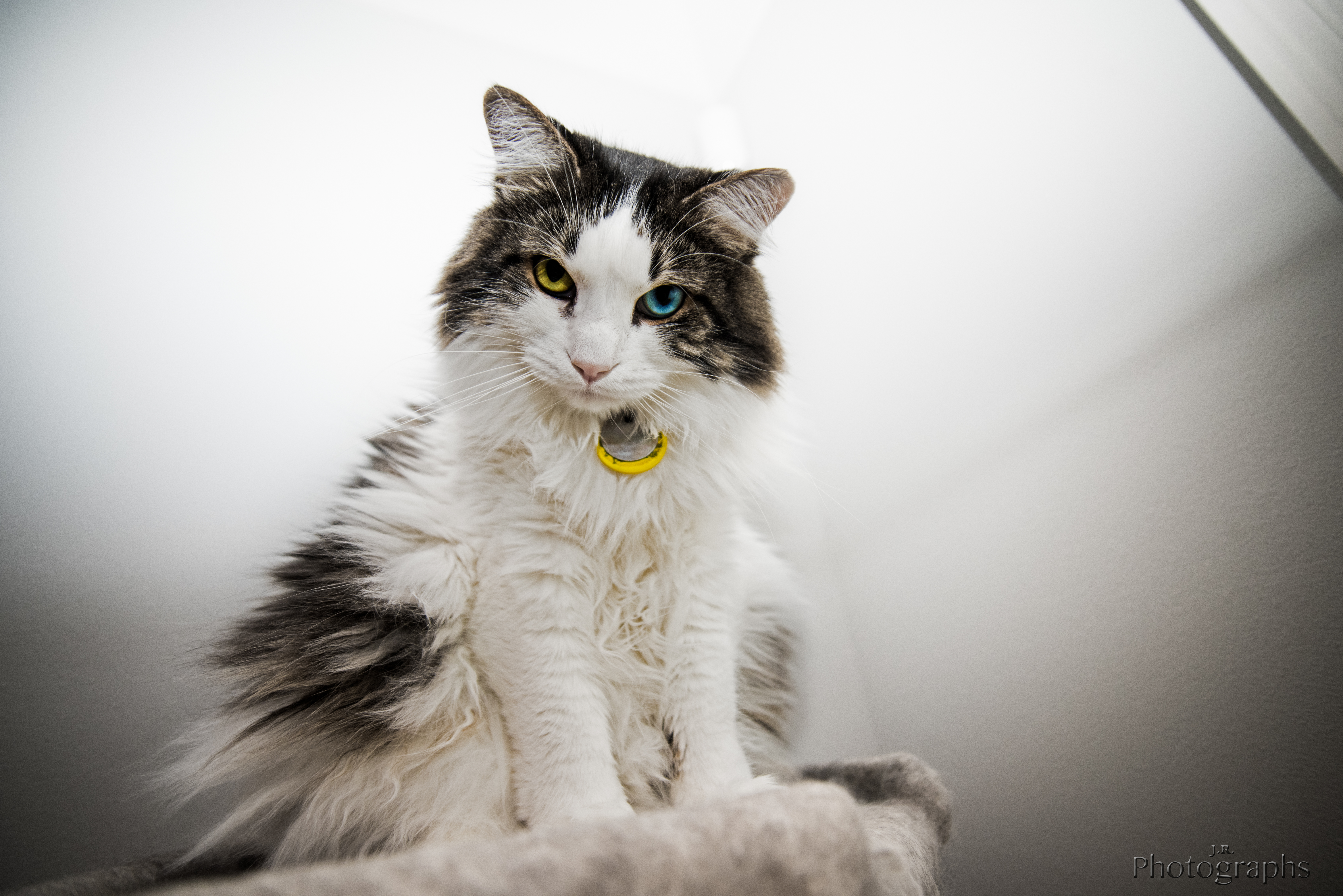 I was hanging around at my best friend’s and her husband’s house, watching their cat climb around in his cat tower/mansion (what do you call those things?) All of sudden, I noticed the cat’s eyes were different color. For whatever reason, I never knew that before of their cat. I got super excited, ran to get my camera, then tried to chase the cat down for a photograph. But see, cats don’t really like photographs… After a few growls and hisses, it ran up his cat tower/mansion (still don’t know what those things are called), all the way up to the top. Undeterred, I pulled out my flash and stretched my arms as high as they could go, taking several photographs. The cat trapped up in his tower, I capture this photograph. Those eyes…