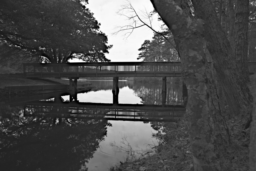 When we went to this park, this one day, we were the only ones there, at least from what we could see. It was very quiet and still. As somewhat of an introvert, I enjoyed it. I saw this bridge acting as the foreground of the very still lake in the back. As I knelt down low to get a good shot, something must have hit the water right near me, whether from above or below, causing a slight ripple. At that instance I took the shot. This is probably my favorite object photo I’ve ever taken. I turned it black and white because the mood felt just right for it.