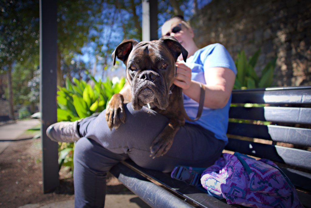 Greenville, S.C. I was strolling down beautiful Greenville in S.C. on a wonderfully sunny day. I saw this dog owner just chillin’ with her dog; and the dog chillin’ on her! He was a cutie and certainly photogenic.